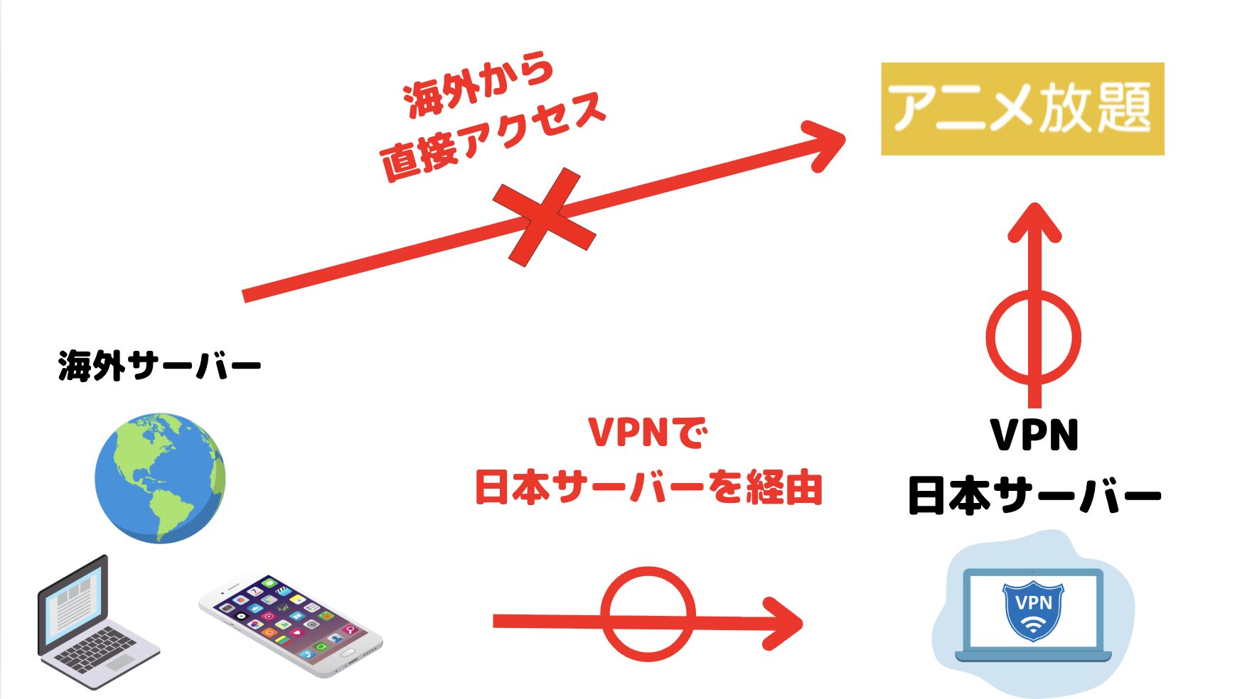 つまり、アニメ放題のように日本国内からしか利用できないサイトを海外から利用したい場合も、VPNを使うことで解決することができるのです。