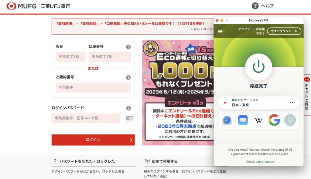 ステップ4:日本サーバーに繋いだまま海外から三菱UFJダイレクトを利用